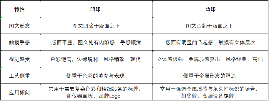 凸印(陽印):指圖文部分高于版面。通過腐蝕或沖壓使空白部分凹陷,保留圖文部分凸起。上色時,可以對凸起部分進行噴漆、電鍍等處理,或者保留鋁材本色,形成強烈的金屬質感與觸摸感。